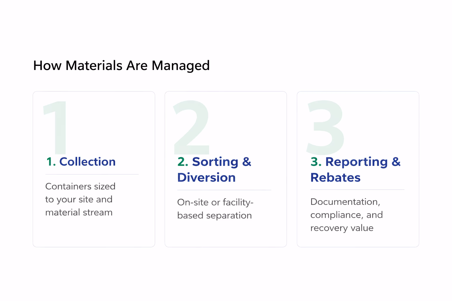 Our services are designed to scale with your project—whether supporting a single jobsite or managing waste streams across multiple locations. Each solution can be tailored to meet site requirements, material volumes, and reporting needs.
