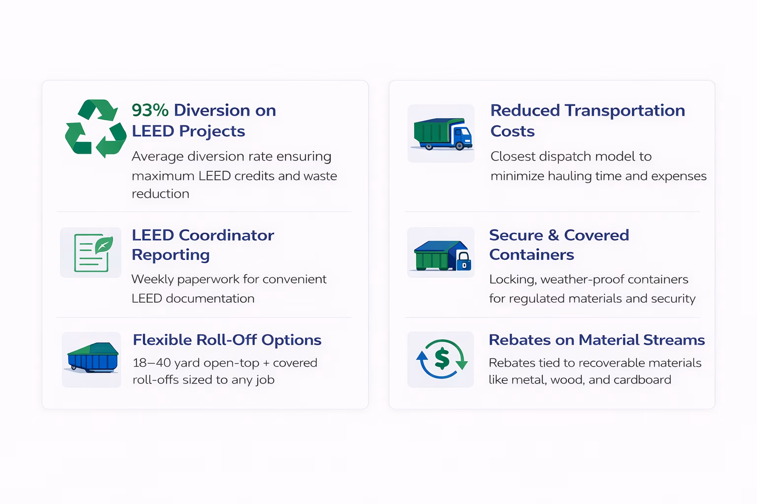 Commercial recycling, roll-off containers, LEED diversion, and industrial equipment solutions for construction and industrial sites.